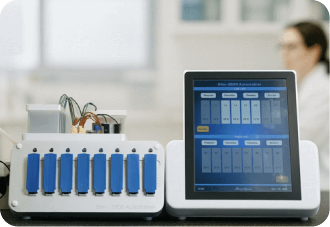 The Elim™-3500 Autostainer is a compact, fully automated tabletop system designed for academic and industrial research labs.
